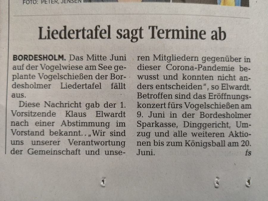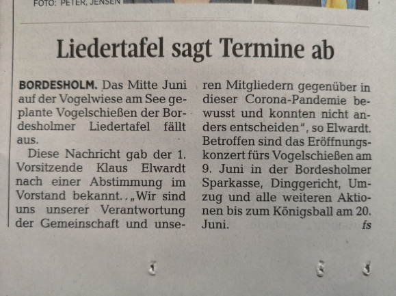das 152. Jahr unserer Bordesholmer Liedertafel wird uns allen vermutlich sehr lange in Erinnerung bleiben. Unsere Vereinsaktivitäten sind in diesem Jahr nahezu vollständig zum Erliegen gekommen. Darüber hinaus ist derzeit noch nicht absehbar, wann und in welcher Form das Vereinsleben wieder in gewohnter Form stattfinden wird.