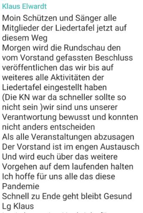 In Anbetracht der zur Zeit herrschenden Gefährdungslage des Coronavirus COVID-19 hat der Vorstand schweren Herzens eine Aussetzung sämtlicher Aktivitäten der Bordesholmer Liedertafel von heute an bis zum 14.April 2020 beschlossen.
