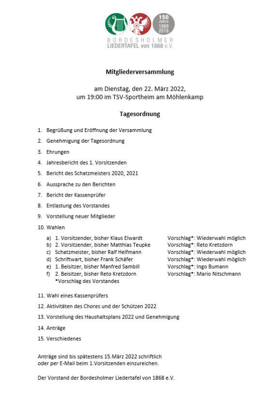 Aufgrund der aktuellen Entwicklung sollten wir aber optimistisch sein, am Ende des nächsten Jahres zumindest unser traditionelles Weihnachtskonzert in der Klosterkirche durchführen zu können. Das Weihnachtskonzert ist auch für die Bürgerinnen und Bürger im Bordesholmer Land in den vergangenen Jahren immer ein Höhepunkt und zugleich besinnlicher Abschluss des Jahres gewesen. Mit dieser Hoffnung sollten wir positiv in das 153. Jahr unserer Bordesholmer Liedertafel starten.
