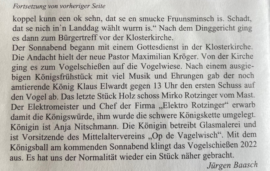 Im Rahmen des Königsballs, am 15.06.2024, bei dem traditionell die Inthronisierung des neuen Königs stattfindet, erhielt der König seinen neuen "Königsnamen": König Ralf, de utgliekende Planer vun Bordesholmer See..
