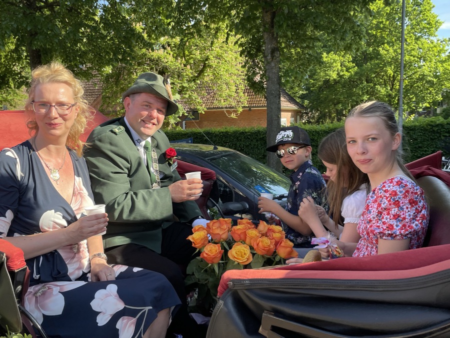 Das scheidende Königspaar Mirko Rotzinger und Anja Nitschmann zusammen mit dem Prinzenpaar in der Kutsche während des Schützenumzugs durch Bordesholm.