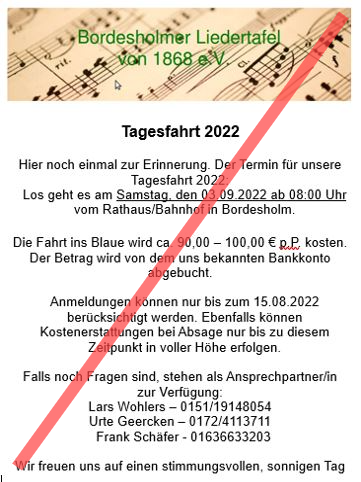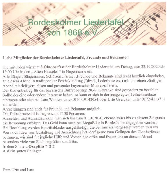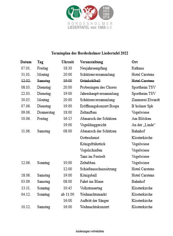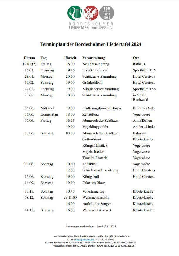 Am 05.11.2023 wollen wir uns ein zweites Mal zum Bosseln treffen. Eure Frauen sind hierzu herzlich eingeladen. Start ist um 10:30 Uhr auf dem Firmengelände der Rohrsanierung Jensen im Gewerbegebiet Böken. Für die weitere Planung bitten wir um Anmeldung bis zum 20.10.2023 über die Zimmerei Elwardt, Tel.: 75970. Für das leibliche Wohl ist gesorgt.